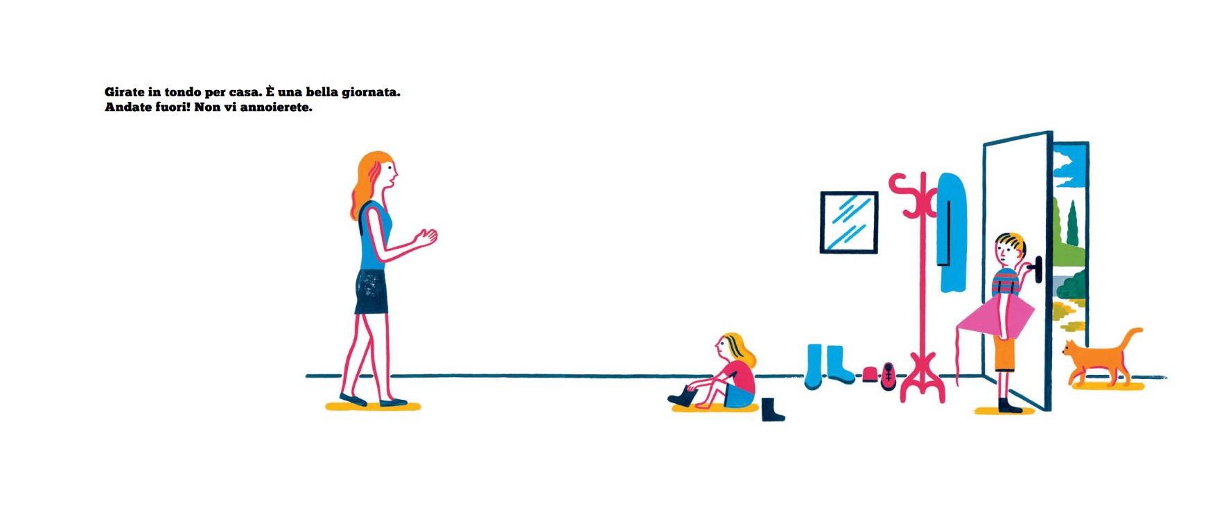 C’è inoltre un doppio ritmo narrativo tra testo e immagine: il primo offre un crescendo più cauto verso l’immaginario mentre il secondo registro offre uno sconfinamento nel fantastico non appena si esce di casa. Forse perché, come ogni raccomandazione genitoriale, i protagonisti delle storie superano e capovolgono le indicazioni, così la loro avventura va ben oltre l’invito materno.